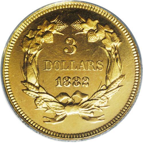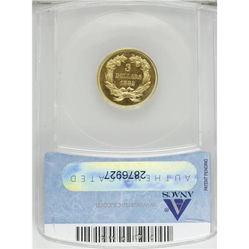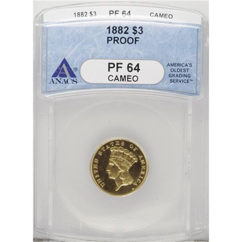 <B>1882 $3 PR64 Cameo ANACS.</B></I> The entire production of proof three dollar gold pieces amounted to just 76 coins, struck at different times throughout the year. The initial output consisted of 25 coins minted in February. This near-Gem example has wonderfully contrasting fields and devices with the usual watery appearance associated with proof gold coins. A few tiny contact marks in the obverse fields keep it out of the Gem category. A thick lint mark at 5 o'clock on the obverse extends out from the border in the shape of a backward P. That mark is the solitary pedigree identifier on this piece.<BR><BR><b>Shipping:</b> Coins & Currency (<a target="_blank" href="http://www.heritageauctions.com/common/shipping.php">view shipping information</a>)