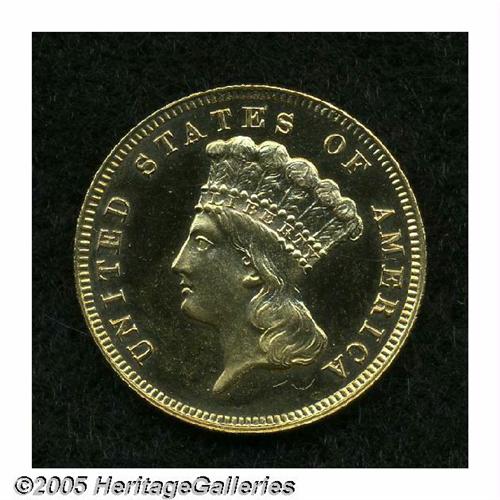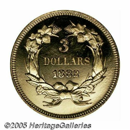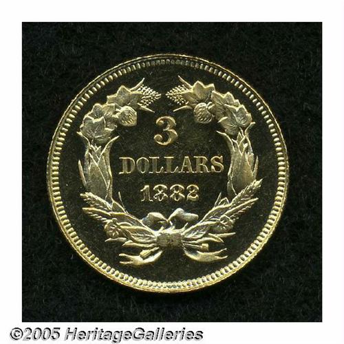 <B>1882<$3> PR64 Deep Cameo Uncertified.</B></I> An intense Proof with bright yellow-gold surfaces and deeply mirrored fields. Sharply struck with exceptional eye appeal for the grade. This example will serve the date or type collector nicely. A mere 76 Proofs were produced according to Mint records, and few of those survive today. Throughout most of the 1880s, Proof mintages for the three dollar gold series gradually increased until reaching a high of 291 coins in 1888. It is those last few issues that are normally encountered.