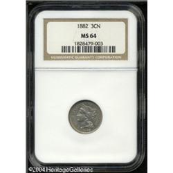 1882 3CN MS64 NGC. Pleasing olive-gray color overl <B>1882 3CN MS64 NGC.</B></I> Pleasing olive-gray color overlays soft luster. Generally nicely struck, save for softness in Liberty's lowest hair curls. <BR><BR><B>Important notice:</B> Heritage usually auctions material at the rate of 200-250 lots per hour. On some occasions eBay Live bid software or the Internet may not be able to keep up with the pace of the auction. We recommend placing a realistic absentee bid now as insurance to avoid disappointment. Occasionally the auctioneer may eliminate or reject an eBay Live bid, and the auctioneer may also reopen a lot after the close of the eBay live bidding (usually because we missed an audience bid), and may reject your bid even if it shows you as the winning bidder. By bidding via eBay Live, you agree that Heritage may award the lot to another bidder at its sole discretion under the circumstances described above or any other reasonable circumstances. Since eBay bids are not shown to us until we open the lot on the floor, we treat those bids just like floor bids. In most cases the floor responds before the eBay bid is presented to us, due to Internet lag time, so for consistency we have made it a policy that floor bids are always considered first over tie eBay live bids. Also please note that all Heritage lots purchased through eBay Live carry a 20% Buyer's Premium. Please make sure you read the Terms and Conditions before you bid. This lot is being auctioned in conjunction with a live floor auction by Heritage Galleries & Auctioneers. All final auction and invoice information will be supplied by Heritage Galleries & Auctioneers, and all other information should be considered preliminary. Lot:5495