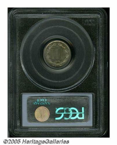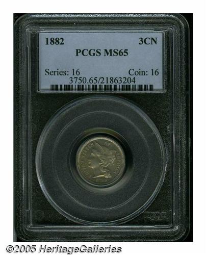 <B>1882<3CN> MS65 PCGS.</B></I> Lovely honey and rose hues embrace this sharply struck and satiny Gem. A splendid example of a date far more available as a proof than a business strike in Gem condition. Population: 17 in 65, 15 finer (5/05).