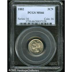 <B>1882 3CN MS66 PCGS.</B></I> A frosty Gem with light nickel surfaces. Highly attractive, and an extremely important opportunity for the specialist. Only three finer examples have been certified by PCGS. Population: 12 in 66, 3 finer (1/05). Lot:5712