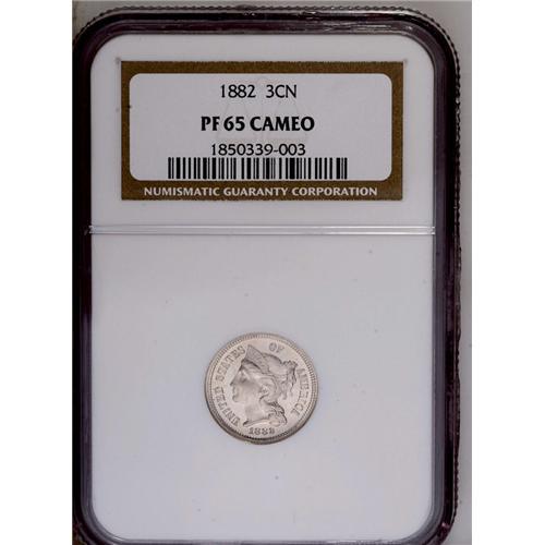 <B>1882<3CN> PR65 Cameo NGC.</B></I> Striking cameo contrast is observed on each side of this Gem proof. The glittering fields and frosted devices seem pristine. A few small milky spots are noted on the reverse fields.