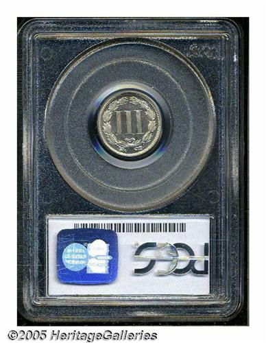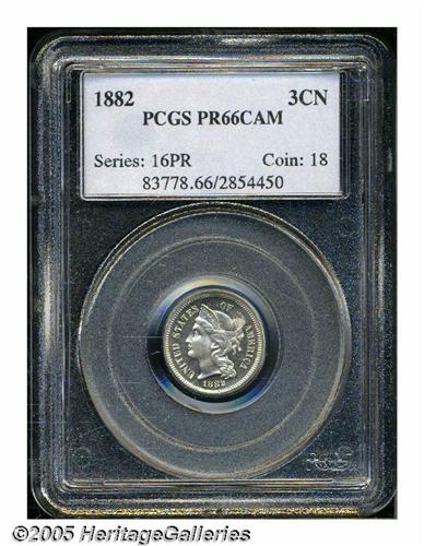 <B>1882<3CN> PR66 Cameo PCGS.</B></I> Essentially brilliant throughout, save for mere traces of milky patina on each side, with shimmering, deeply reflective fields, and starkly contrasted, mildly frosted devices. Seemingly pristine, and a visually appealing Premium Gem proof.