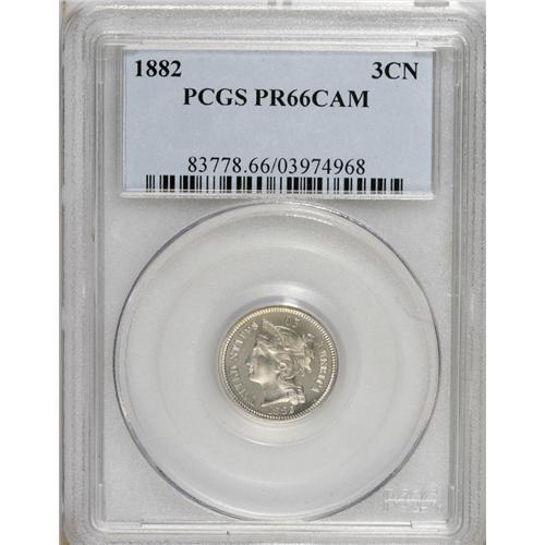<B>1882 3CN PR66 Cameo PCGS.</B></I> Icy motifs contrast with the lightly toned and glassy fields. This exactingly struck and beautiful Premium Gem offers imposing eye appeal. Population: 57 in 66 Cameo, 53 finer (2/07).<BR><BR><b>Shipping:</b> Coins & Currency (<a target="_blank" href="http://www.heritageauctions.com/common/shipping.php">view shipping information</a>)