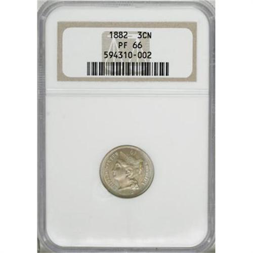 <B>1882 3CN PR66 NGC.</B></I> Lime and orange toning aids the eye appeal of this penetratingly struck Premium Gem. Satiny and splendidly preserved.<BR><BR><B>Coin Engraver:</B> James B. Longacre<BR><BR><b>Shipping:</b> Coins & Currency (<a target="_blank" href="http://www.heritageauctions.com/common/shipping.php">view shipping information</a>)