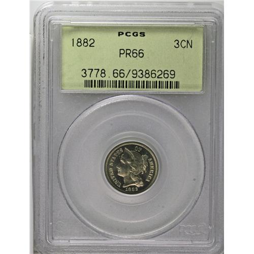 <B>1882 3CN PR66 PCGS.</B></I> Light honey-gold toning visits this lustrous, needle-sharp, and mark-free Premium Gem. A few pinpoint flecks deny perfection. Encapsulated in an old green label holder.<BR><I>From The Jones Beach Collection.</B></I><BR><BR><b>Shipping:</b> Coin/Currency (<a target="_blank" href="http://www.heritageauctions.com/common/shipping.php">view shipping information</a>)
