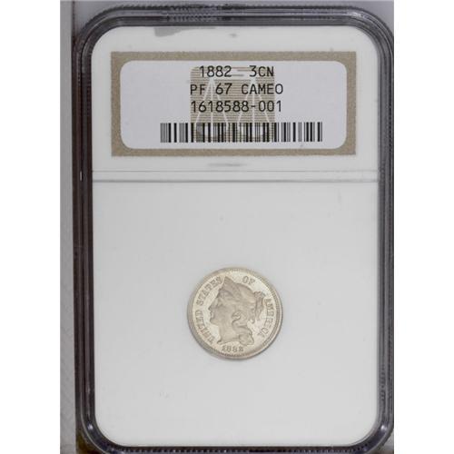 <B>1882<3CN> PR67 Cameo NGC.</B></I> A razor-sharp and essentially immaculate Superb Gem. A dusting of gold toning confirms the originality. Census: 19 in 67 Cameo, 1 finer (2/06).