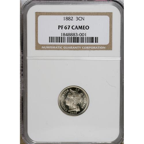 <B>1882 3CN PR67 Cameo NGC.</B></I> Untoned surfaces display crisply struck motifs and pronounced contrast irrespective of the angle from which the piece is viewed. A few tiny flecks are noted on the obverse. Census: 21 in 67 Cameo, 2 finer (2/07).<BR><BR><b>Shipping:</b> Coins & Currency (<a target="_blank" href="http://www.heritageauctions.com/common/shipping.php">view shipping information</a>)