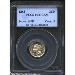 1882 3CN PR67 Cameo PCGS. Faintly variegated golden-brown patina graces the surfaces of this well st
