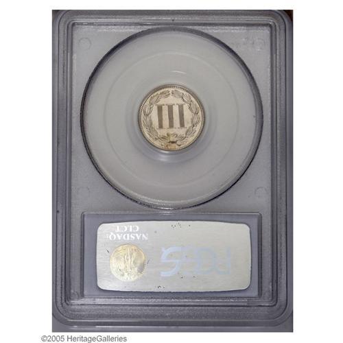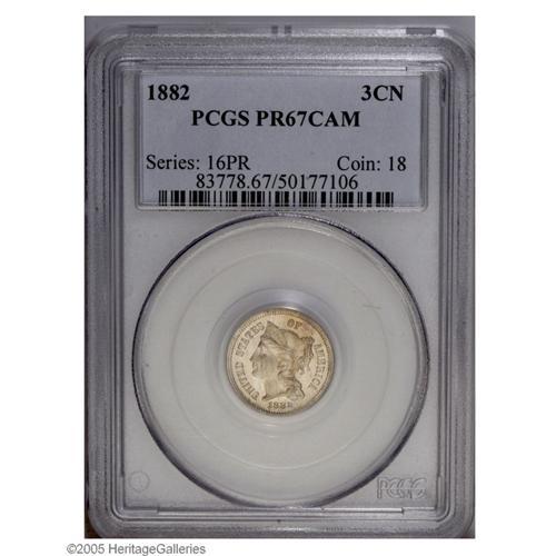 <B>1882<3CN> PR67 Cameo PCGS.</B></I> Streaks of light tan grace bright and virtually flawless proof surfaces. The design features are sharply struck throughout, and the cameo contrast is heightened as the coin is rotated beneath a light source. Population: 41 in 67, 4 finer (9/05).