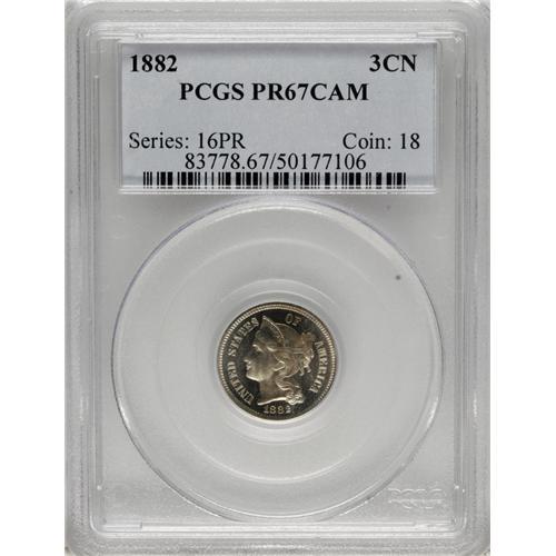 <B>1882 3CN PR67 Cameo PCGS.</B></I> Streaks of light tan grace bright and virtually flawless proof surfaces. The design features are sharply struck throughout, including all of the lines on the III, and the cameo contrast is heightened as the coin is rotated beneath a light source. Population: 50 in 67, 4 finer (3/07).<BR><BR><b>Shipping:</b> Coins & Currency (<a target="_blank" href="http://www.heritageauctions.com/common/shipping.php">view shipping information</a>)