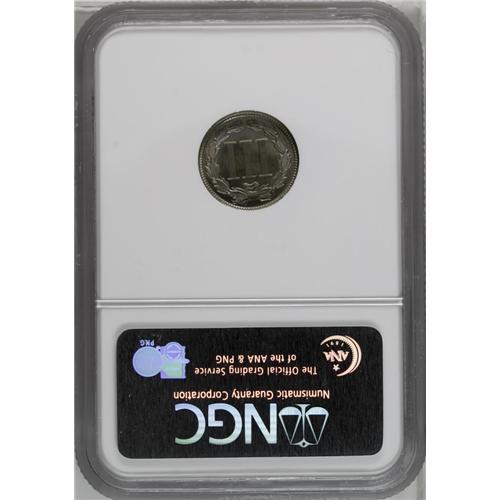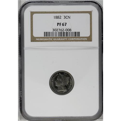 <B>1882<3CN> PR67 NGC.</B></I> A Superb proof with deep gray surfaces and pale lilac toning. The fields are deeply mirrored, around frosty and lustrous devices. Census: 58 in 67, 4 finer (2/06).<BR><I>From The Frank DuVall Collection.</B></I>