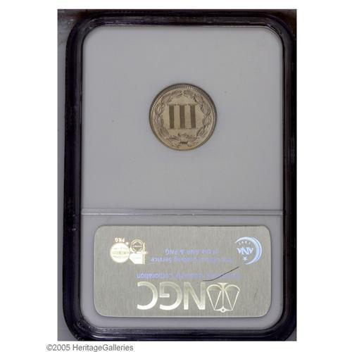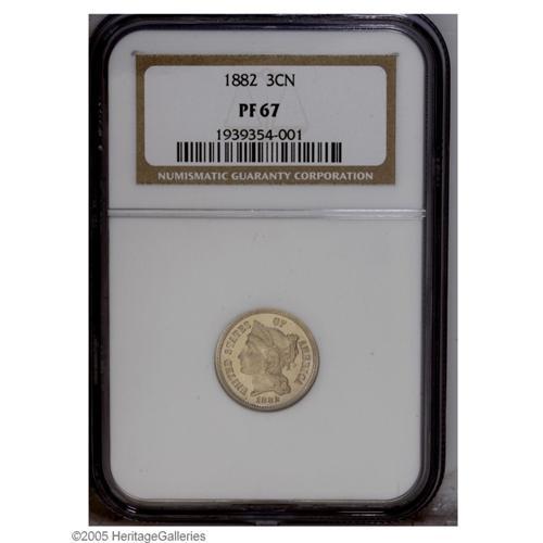 <B>1882<3CN> PR67 NGC.</B></I> Attractive and well reserved proof surfaces display a light coating of champagne color. The design features are well preserved throughout. Population: 59 in 67, 4 finer (9/05).