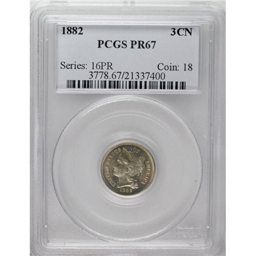 <B>1882 3CN PR67 PCGS.</B></I> This beautiful superb proof is exquisitely struck, and displays a light coat of gold-tan color. Both sides are impeccably preserved. Population: 88 in 67, 7 finer (11/06).<BR><BR><b>Shipping:</b> Coin/Currency (<a target="_blank" href="http://www.heritageauctions.com/common/shipping.php">view shipping information</a>)