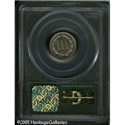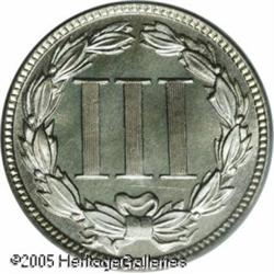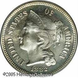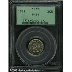 <B>1882 3CN PR67 PCGS.</B></I> This is a stunning example with medium gray color accented by rainbow iridescence. The fields are attractively mirrored, deeper on the reverse, and the design elements are sharply defined. This is an exquisite Superb Gem Proof example. Population: 92 in 67, 8 finer (1/05). Lot:5818