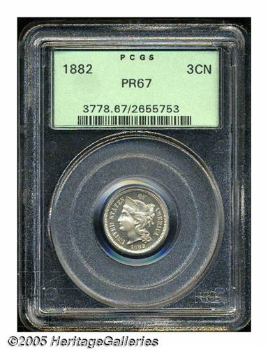 <B>1882<3CN> PR67 PCGS.</B></I> Well struck and immaculately preserved with olive-gold surfaces that have a faint dusting of tan-brown patina on the reverse.