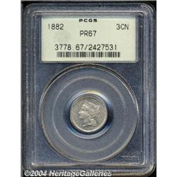 <B>1882<3CN> PR67 PCGS.</B></I> Nicely struck, with pleasing light-gray patina over virtually mark-free surfaces. Population: 95 in 67, 8 finer (3/04). <BR><BR><B>Important notice:</B> Heritage usually auctions material at the rate of 200-250 lots per hour. On some occasions eBay Live bid software or the Internet may not be able to keep up with the pace of the auction. We recommend placing a realistic absentee bid now as insurance to avoid disappointment. Occasionally the auctioneer may eliminate or reject an eBay Live bid, and the auctioneer may also reopen a lot after the close of the eBay live bidding (usually because we missed an audience bid), and may reject your bid even if it shows you as the winning bidder. By bidding via eBay Live, you agree that Heritage may award the lot to another bidder at its sole discretion under the circumstances described above or any other reasonable circumstances. Since eBay bids are not shown to us until we open the lot on the floor, we treat those bids just like floor bids. In most cases the floor responds before the eBay bid is presented to us, due to Internet lag time, so for consistency we have made it a policy that floor bids are always considered first over tie eBay live bids. Also please note that all Heritage lots purchased through eBay Live carry a 20% Buyer's Premium. Please make sure you read the Terms and Conditions before you bid.
