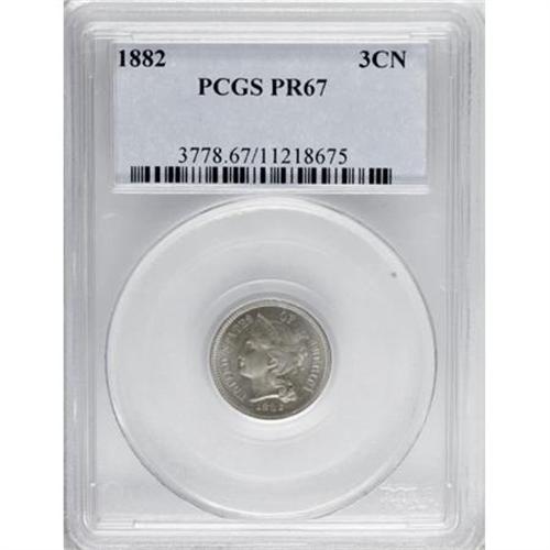 <B>1882 3CN PR67 PCGS.</B></I> PCGS Population (89/7). NGC Census: (57/4). Mintage: 3,100. Numismedia Wsl. Price for NGC/PCGS coin in PR67: $1,375. (#3778)<BR><BR><B>Coin Engraver:</B> James B. Longacre<BR><BR><b>Shipping:</b> Coins & Currency (<a target="_blank" href="http://www.heritageauctions.com/common/shipping.php">view shipping information</a>\)