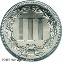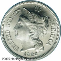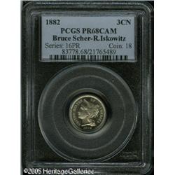 <B>1882 3CN PR68 Cameo PCGS.</B></I> A razor-sharp representative with nicely frosted motifs and barely a whisper of yellow-gold color. A short lintmark (as made) is noted at 1:30 on the obverse, mentioned as a pedigree marker since the immaculate surfaces reveal no post-strike imperfections. Despite the uncharacteristically high mintage of the prior year, in 1882 there was a combined proof and business strike production of only 25,300 pieces. This piece is tied with two others as the finest certified by PCGS, although that service has encapsulated a solitary Deep Cameo specimen as PR67.<BR><I>From the Bruce Scher #1 All-Time PCGS Registry Set.</B></I> Lot:4042