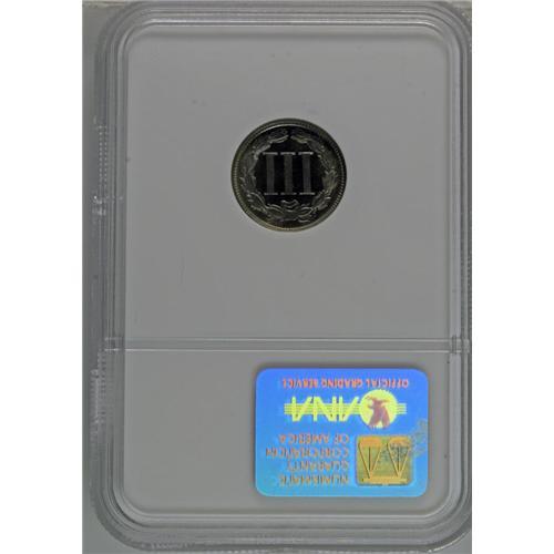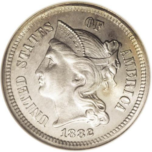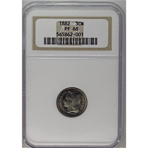 <B>1882<3CN> PR68 NGC.</B></I> This low-mintage issue is generally only available in proof format, as only 22,200 business strikes were produced. This is one of the finest examples known and is tied with 11 other pieces certified by NGC and PCGS at the PR68 level. The brightly mirrored fields radiate through the multicolored jade-green, ice-blue, and rose toning. Census: 4 in 68, 0 finer (7/06).