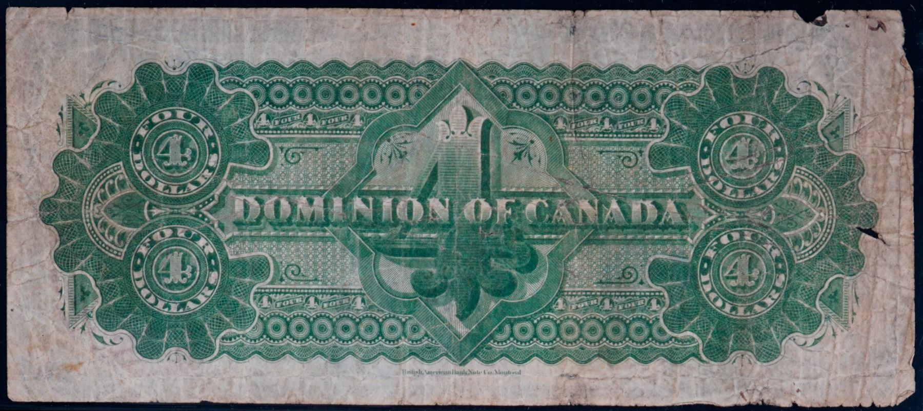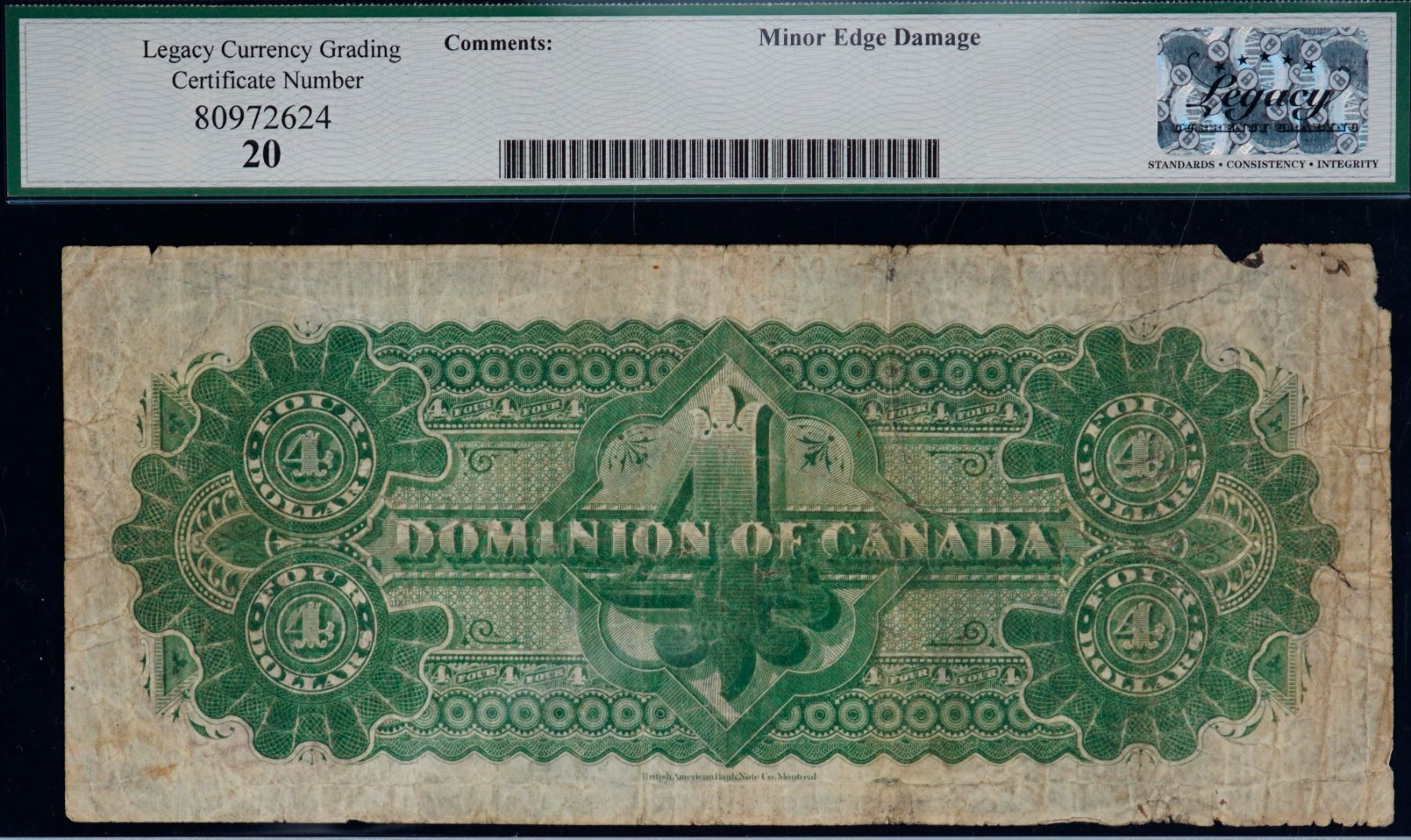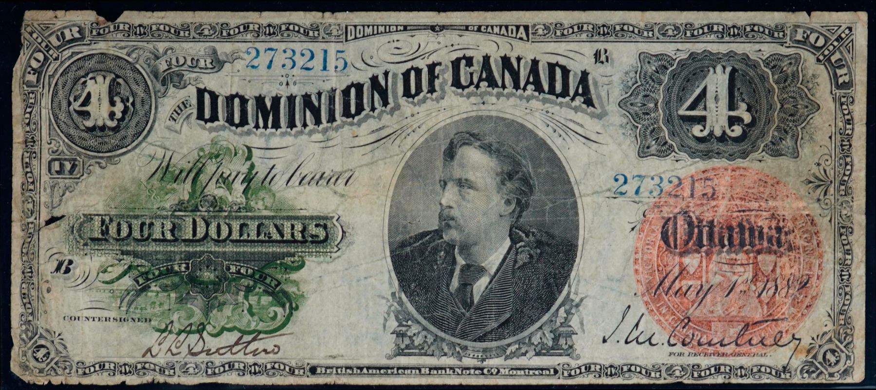1882 $4 DC-10 #273215 Legacy Very Fine-20 with minor border issues. Popular and sought-after banknote.