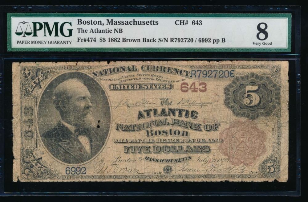 One 1882 $5 Atlantic National Bank Note PMG 8.