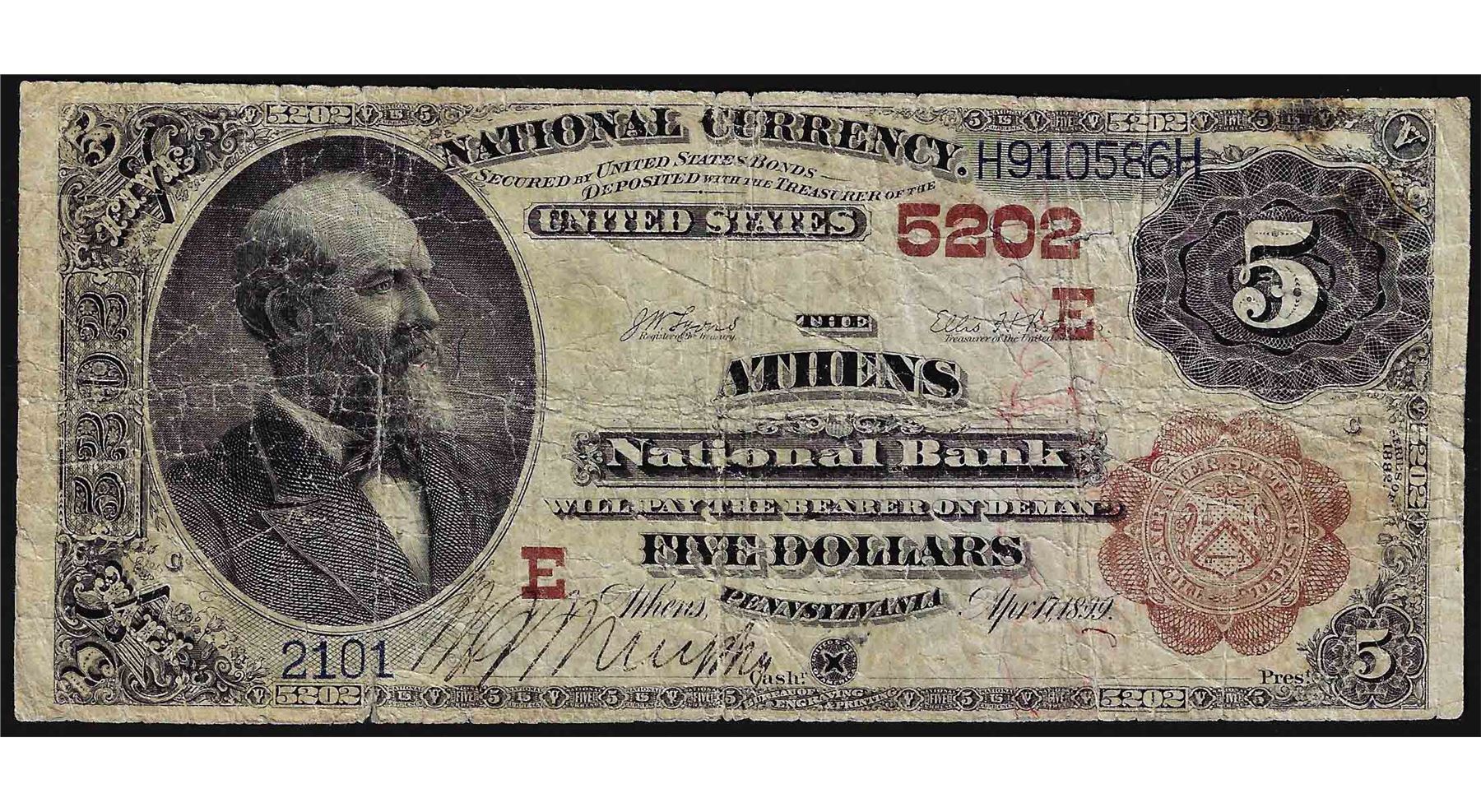 One 1882 $5 Brown Back Athens Pennsylvania National Currency Note.