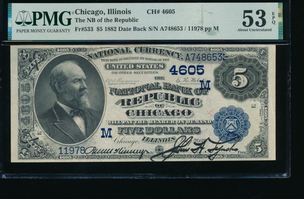 One 1882 $5 Chicago IL National PMG 53EPQ.