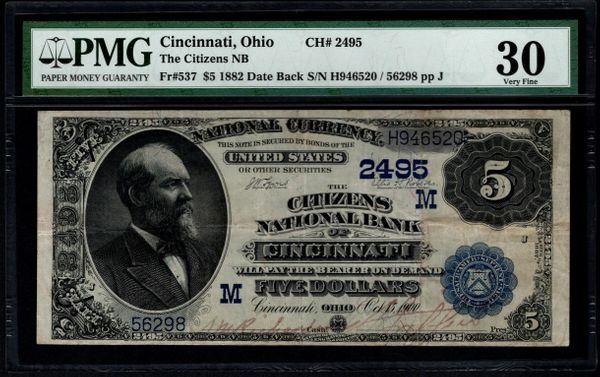 One 1882 $5 Cincinnati National Bank Note PMG 30.