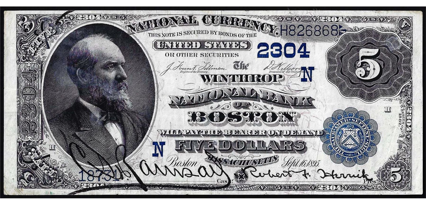 One 1882 $5 DB Winthrop NB of Boston, MA CH# 2304 National Currency Note.