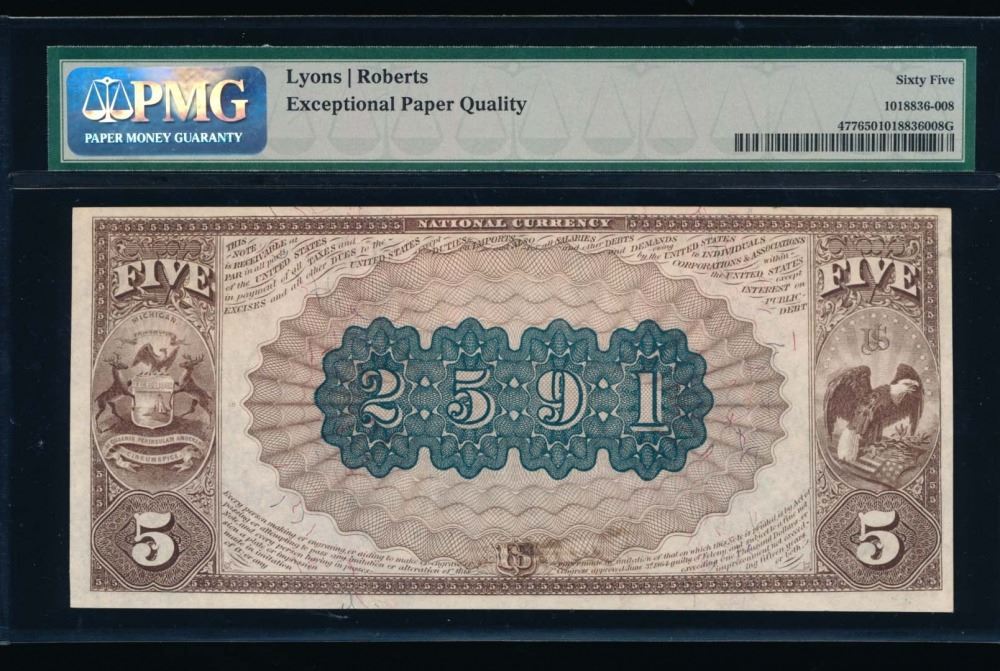 One 1882 $5 Detroit National Bank Note PMG 65.