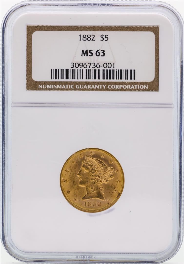 One 1882 $5 Libertry Head Half Eagle Gold Coin NGC MS63. NGC Certified.