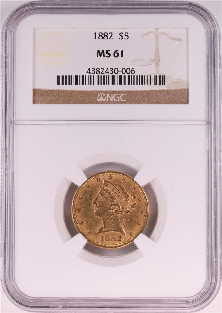 One 1882 $5 Liberty Head Half Eagle Gold Coin NGC MS61. NGC Certified.