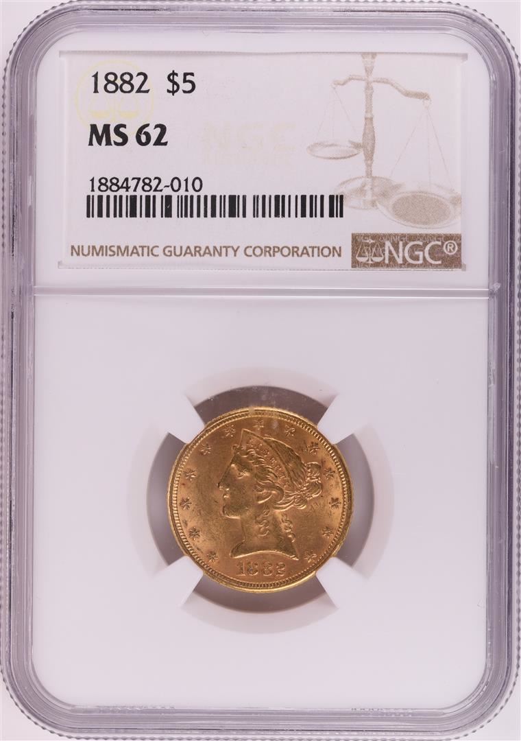 One 1882 $5 Liberty Head Half Eagle Gold Coin NGC MS62. NGC Certified.