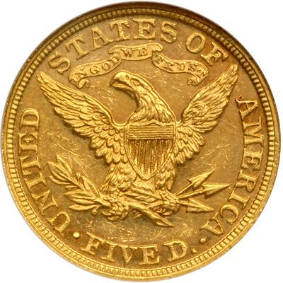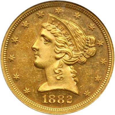 1882 $5 Liberty. NGC graded Proof 63 Cameo. Only 48 pieces struck in Proof. Light even golden toning. Some light signs of handling in the field on both sides. Mellow gold-on-gold somersaulting cameo frost whose radiance on both sides of this cleanly original example must be seen to be appreciated. A crisp strike, as well as freedom from the usual weakness typical for business strike 1882s. Proofs were well made. And that is why this is a coin to jump at before it's sale is history. Pop 4; 2 finer, 1 in 64, and 1 in 65 (PCGS # 88477) .