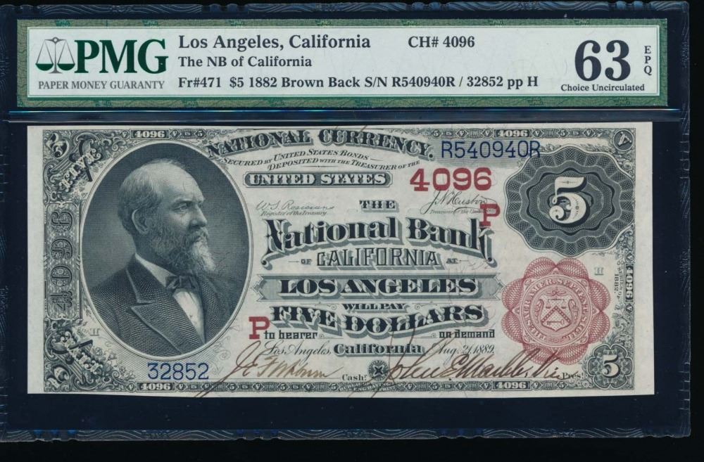 One 1882 $5 Los Angeles National Bank Note PMG 63EPQ.