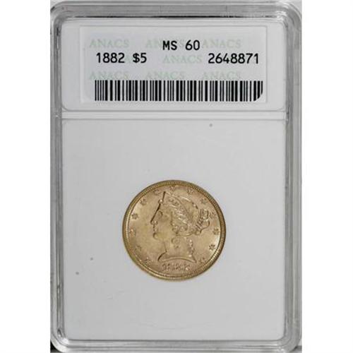 <B>1882 $5 MS60 ANACS.</B></I> NGC Census: (225/4148). PCGS Population (231/2009). Mintage: 2,514,568. Numismedia Wsl. Price for NGC/PCGS coin in MS60: $225. (#8358)<BR><BR><B>Coin Engraver:</B> Christian Gobrecht<BR><BR><b>Shipping:</b> Coins & Currency (<a target="_blank" href="http://www.heritageauctions.com/common/shipping.php">view shipping information</a>\)