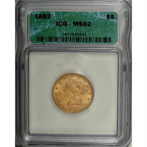 <B>1882 $5 MS62 ICG.</B></I> NGC Census: (1830/1385). PCGS Population (959/613). Mintage: 2,514,568. Numismedia Wsl. Price for NGC/PCGS coin in MS62: $365. (#8358)<BR><BR><B>Coin Engraver:</B> Christian Gobrecht<BR><BR><b>Shipping:</b> Coins & Currency (<a target="_blank" href="http://www.heritageauctions.com/common/shipping.php">view shipping information</a>)