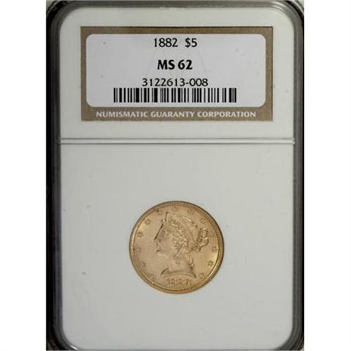 <B>1882 $5 MS62 NGC.</B></I> . NGC Census: (1813/1381). PCGS Population (950/610). Mintage: 2,514,568. Numismedia Wsl. Price for NGC/PCGS coin in MS62: $365. (#8358)<BR><BR><B>Coin Engraver:</B> Christian Gobrecht<BR><BR><b>Shipping:</b> Coins & Currency (<a target="_blank" href="http://www.heritageauctions.com/common/shipping.php">view shipping information</a>)