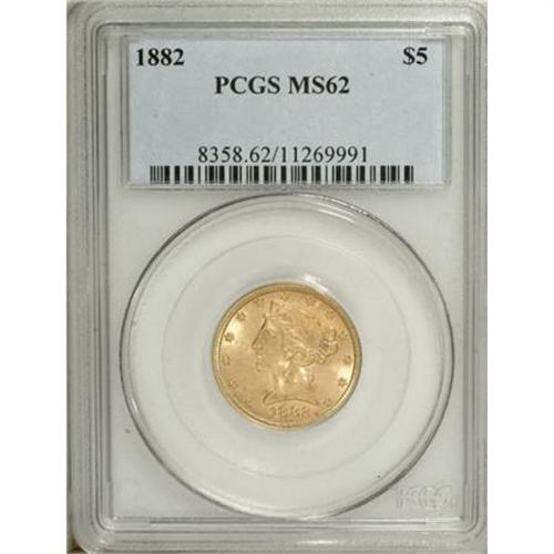 <B>1882 $5 MS62 PCGS.</B></I> PCGS Population (931/586). NGC Census: (1729/1342). Mintage: 2,514,568. Numismedia Wsl. Price for NGC/PCGS coin in MS62: $340. (#8358)<BR><BR><B>Coin Engraver:</B> Christian Gobrecht<BR><BR><b>Shipping:</b> Coins & Currency (<a target="_blank" href="http://www.heritageauctions.com/common/shipping.php">view shipping information</a>)