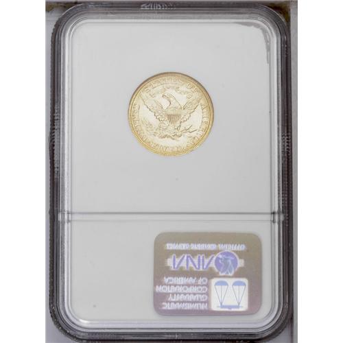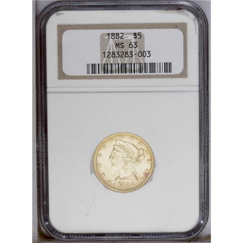 <B>1882<$5> MS63 NGC.</B></I> This boldly struck and fully lustrous straw-gold piece is notable for a small area of aqua-blue and rose toning between the final two stars. <BR><BR><B>Important notice:</B> Heritage usually auctions material at the rate of 200-250 lots per hour. On some occasions eBay Live bid software or the Internet may not be able to keep up with the pace of the auction. We recommend placing a realistic absentee bid now as insurance to avoid disappointment. Occasionally the auctioneer may eliminate or reject an eBay Live bid, and the auctioneer may also reopen a lot after the close of the eBay live bidding (usually because we missed an audience bid), and may reject your bid even if it shows you as the winning bidder. By bidding via eBay Live, you agree that Heritage may award the lot to another bidder at its sole discretion under the circumstances described above or any other reasonable circumstances. Since eBay bids are not shown to us until we open the lot on the floor, we treat those bids just like floor bids. In most cases the floor responds before the eBay bid is presented to us, due to Internet lag time, so for consistency we have made it a policy that floor bids are always considered first over tie eBay live bids. Also please note that all Heritage lots purchased through eBay Live carry a 20% Buyer's Premium. Please make sure you read the Terms and Conditions before you bid. This lot is being auctioned in conjunction with a live floor auction by Heritage Galleries & Auctioneers. All final auction and invoice information will be supplied by Heritage Galleries & Auctioneers, and all other information should be considered preliminary. Lot:2804 <BR><BR><B>Winning Notification and Billing:</B> After the FINAL session in this auction is complete, Heritage will send e-mail and snail mail invoices. This process normally takes several days. All final auction and invoice information will be supplied by Heritage Galleries & Auctioneers, and all other information should be considered preliminary. <BR><BR>This auction will be conducted on a live auction floor and over the Internet through eBay Live. If you choose to place an absentee bid, please take a moment to <font color='#0000ff'><u><a href='http://pages.ebay.com/liveauctions/help/before/laabsentee.html'>learn how eBay Live absentee bidding works</a></u></font><font color='#000000'>