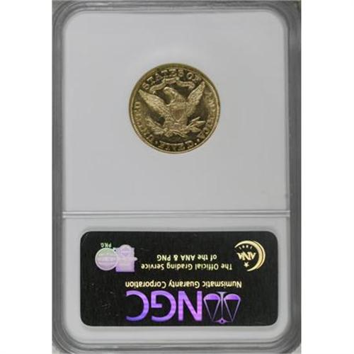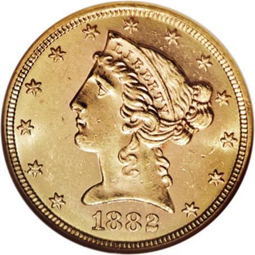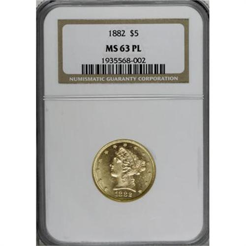 <B>1882 $5 MS63 Prooflike NGC.</B></I> This decidedly prooflike example displays bright honey-gold coloration and flashy mint frost. The design elements are sharply struck throughout, and there are a normal number of scattered abrasions on each side, for the grade. A readily available issue that becomes rare in Prooflike condition. Census: 2 in 63 Prooflike, 0 finer (8/07). <BR><BR><B>Coin Engraver:</B> Christian Gobrecht<BR><BR><b>Shipping:</b> Coins & Currency (<a target="_blank" href="http://www.heritageauctions.com/common/shipping.php">view shipping information</a>)