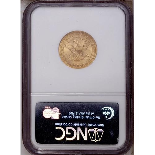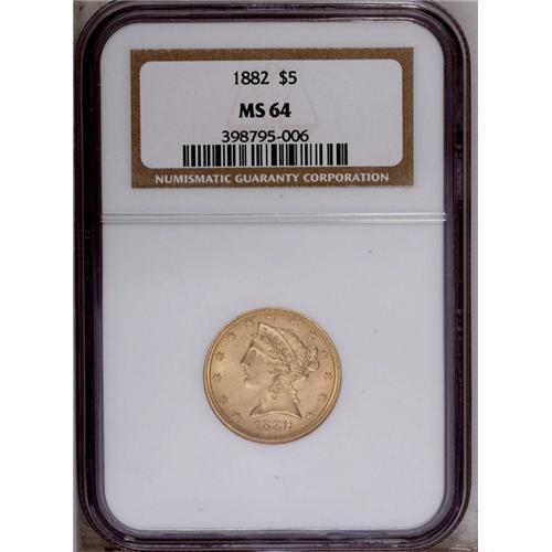 <B>1882 $5 MS64 NGC.</B></I> A lustrous chestnut-gold representative, boldly struck and suitably preserved. The final year in a short run (1880 to 1882) of high mintage Half Eagles from the Philadelphia Mint; during those same years, the facility struck comparatively few Double Eagles.
