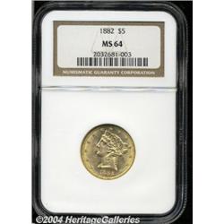 <B>1882<$5> MS64 NGC.</B></I> Booming luster and generally clean surfaces ensure the quality of this well struck example. The reverse legends are strike doubled. <BR><BR><B>Important notice:</B> Heritage usually auctions material at the rate of 200-250 lots per hour. On some occasions eBay Live bid software or the Internet may not be able to keep up with the pace of the auction. We recommend placing a realistic absentee bid now as insurance to avoid disappointment. Occasionally the auctioneer may eliminate or reject an eBay Live bid, and the auctioneer may also reopen a lot after the close of the eBay live bidding (usually because we missed an audience bid), and may reject your bid even if it shows you as the winning bidder. By bidding via eBay Live, you agree that Heritage may award the lot to another bidder at its sole discretion under the circumstances described above or any other reasonable circumstances. Since eBay bids are not shown to us until we open the lot on the floor, we treat those bids just like floor bids. In most cases the floor responds before the eBay bid is presented to us, due to Internet lag time, so for consistency we have made it a policy that floor bids are always considered first over tie eBay live bids. Also please note that all Heritage lots purchased through eBay Live carry a 20% Buyer's Premium. Please make sure you read the Terms and Conditions before you bid.