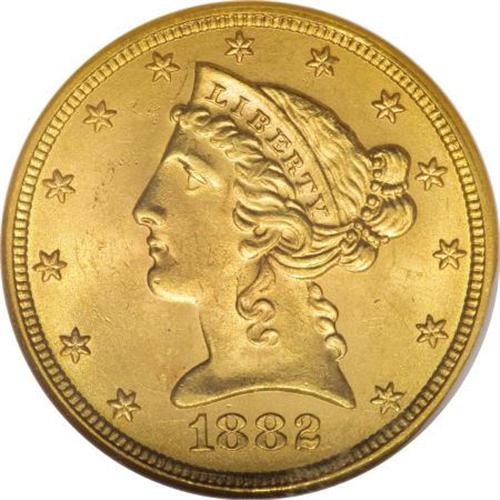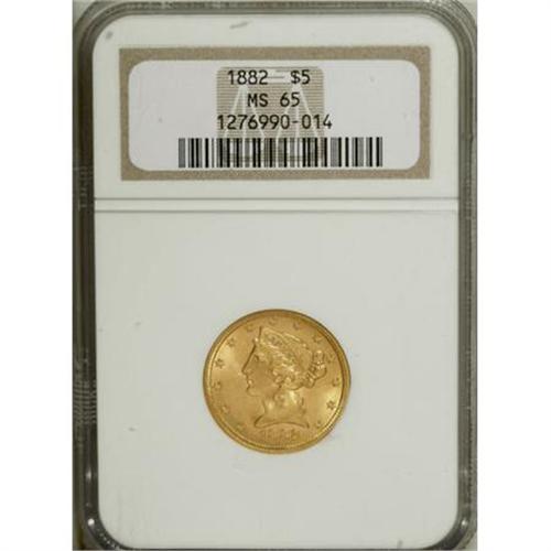 <B>1882 $5 MS65 NGC.</B></I> A splendid Gem, this piece is an important condition rarity in the Liberty half eagle series, as shown by the population data. Just two finer pieces have been certified by NGC, and no finer examples have been examined by PCGS. Both sides are sharply detailed with rich and fully brilliant orange-gold luster. Census: 27 in 65, 2 finer (6/07).<I><BR>From The Silver Fox Collection.</B></I><BR><BR><b>Shipping:</b> Coins & Currency (<a target="_blank" href="http://www.heritageauctions.com/common/shipping.php">view shipping information</a>)