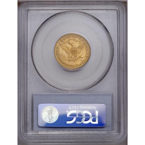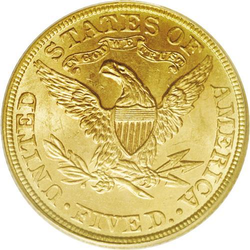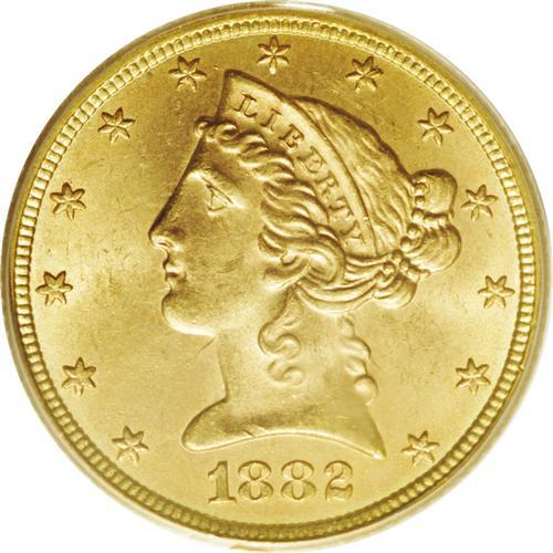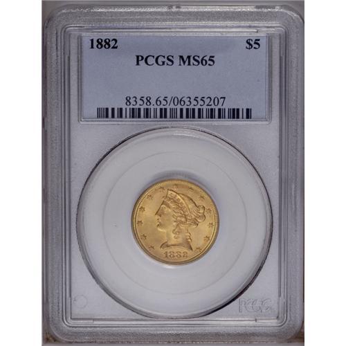 <B>1882<$5> MS65 PCGS.</B></I> Although a relatively common issue in lower Mint State grades, precious few 1882 half eagles survive as Gems. The strong strike and soft, frosted luster are characteristic of the issue, but a near absence of surface marks places it head and shoulders above the typical example. Some olive-green patina borders each side. Population: 5 in 65, 0 finer (1/06).