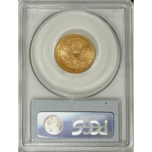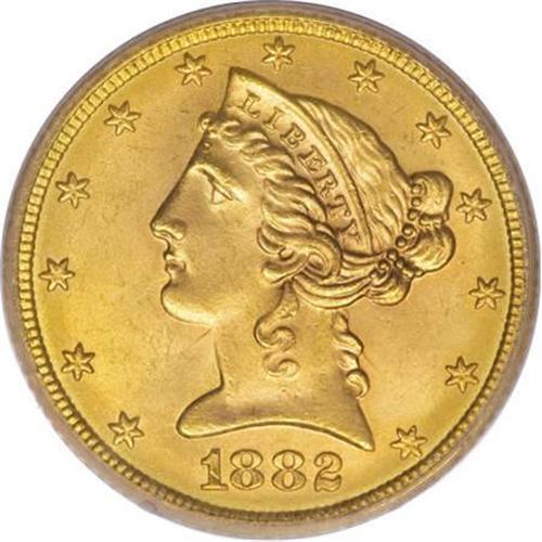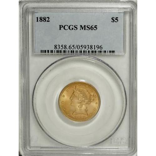 <B>1882 $5 MS65 PCGS.</B></I> The issue's plentiful mintage of more than 2.5 million pieces has translated into a surprisingly small number of Gems available. This glowing representative is one such coin, with a crisp strike and coruscating luster over lush orange-gold surfaces. Tied for the finest certified by PCGS and an essential for the competitive Registry collector (7/07).<BR><BR><B>Coin Engraver:</B> Christian Gobrecht<BR><BR><b>Shipping:</b> Coins & Currency (<a target="_blank" href="http://www.heritageauctions.com/common/shipping.php">view shipping information</a>\)