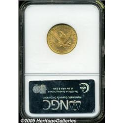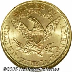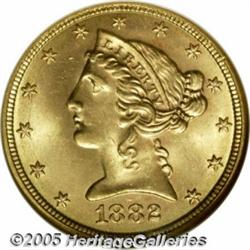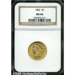 <B>1882 $5 MS66 NGC.</B></I> This is one of the finest examples of this date currently certified. Thousands of Mint State coins survive from the original mintage of over 2.5 million coins, but most are MS60 to MS63 grades. Few Choice Mint State examples are known, and Gems are virtually never encountered. The example that we are offering is sharply struck and has frosty yellow-gold luster with hints of rose toning. A few tiny abrasions are visible in the fields, but these are entirely insignificant. Population: 2 in 66, 0 finer (2/05).