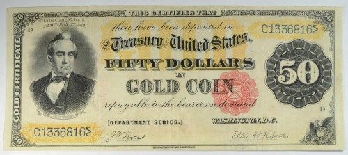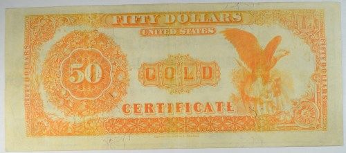1882 $50.00 GOLD CERT. NICE XF, MINOR FOLDS SHOWING, NICE COLORS