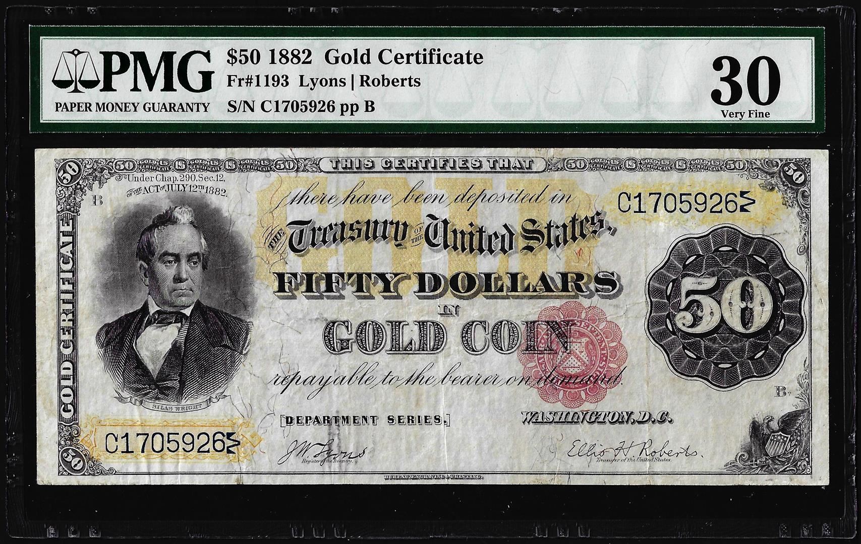 One 1882 $50 Gold Certificate Note Fr.1193 PCGS Very Fine 30. PCGS Graded.